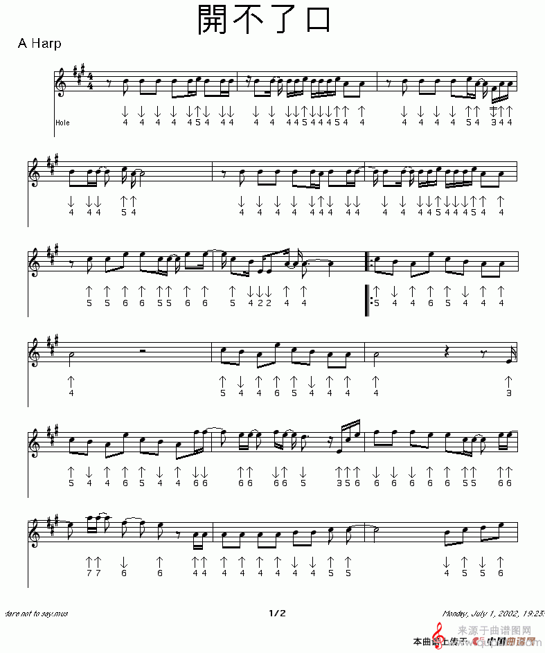 曲谱图网为您提供开不了口(口琴口风琴五线简谱)找谱子,就上曲谱图网。