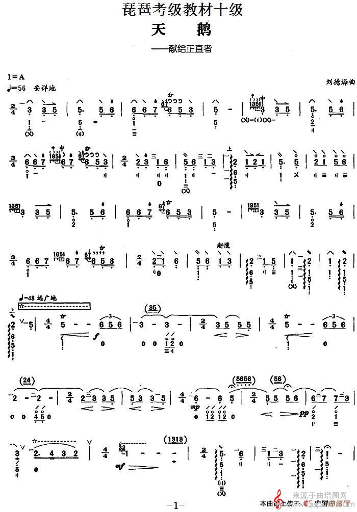 曲谱图网为您提供琵琶考级教材十级:天鹅(刘德海曲)找谱子,就上曲谱图网。