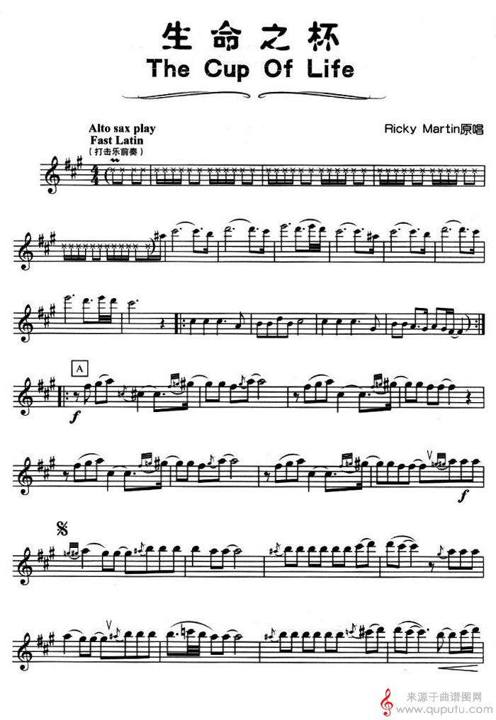 曲谱图网为您提供生命之杯(萨克斯演奏五线谱)找谱子,就上曲谱图网。