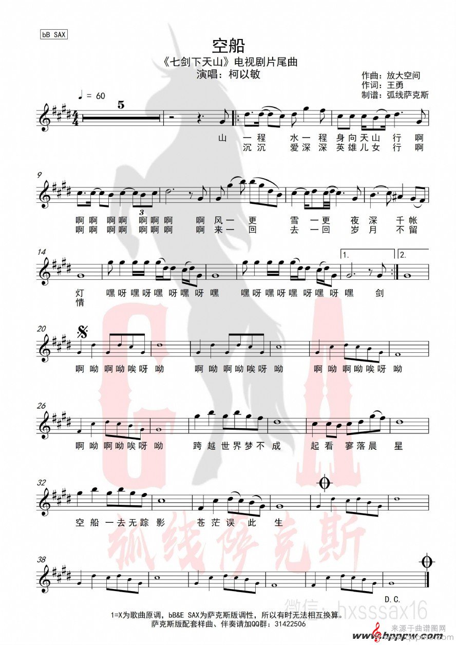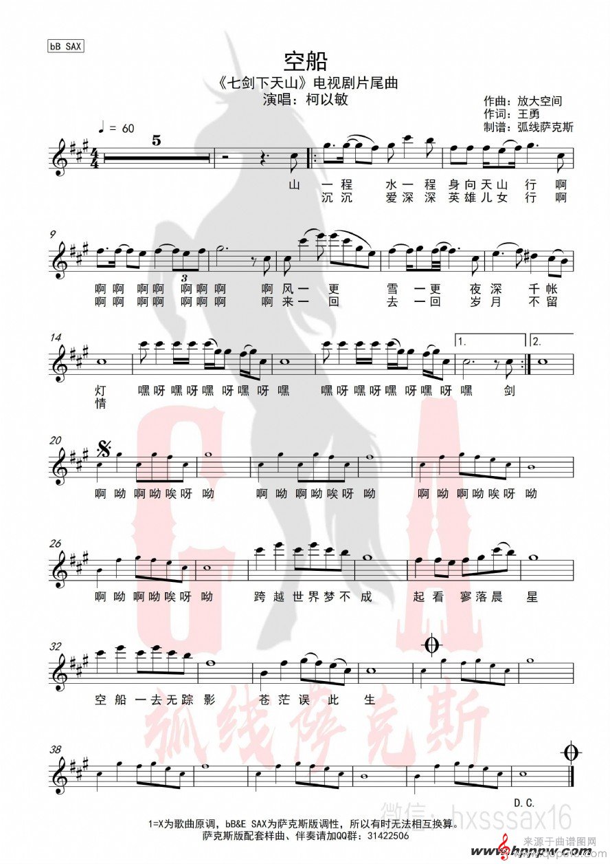 曲谱图网为您提供空船(电视剧《七剑下天山》片尾曲萨克斯简谱带歌词)找谱子,就上曲谱图网。