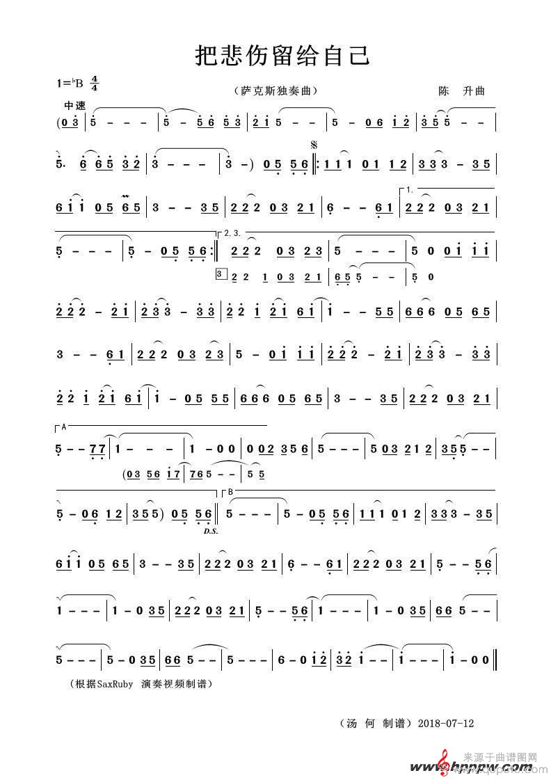 曲谱图网为您提供把悲伤留给自己(把悲伤留给自己萨克斯独奏演奏简谱曲谱)找谱子,就上曲谱图网。
