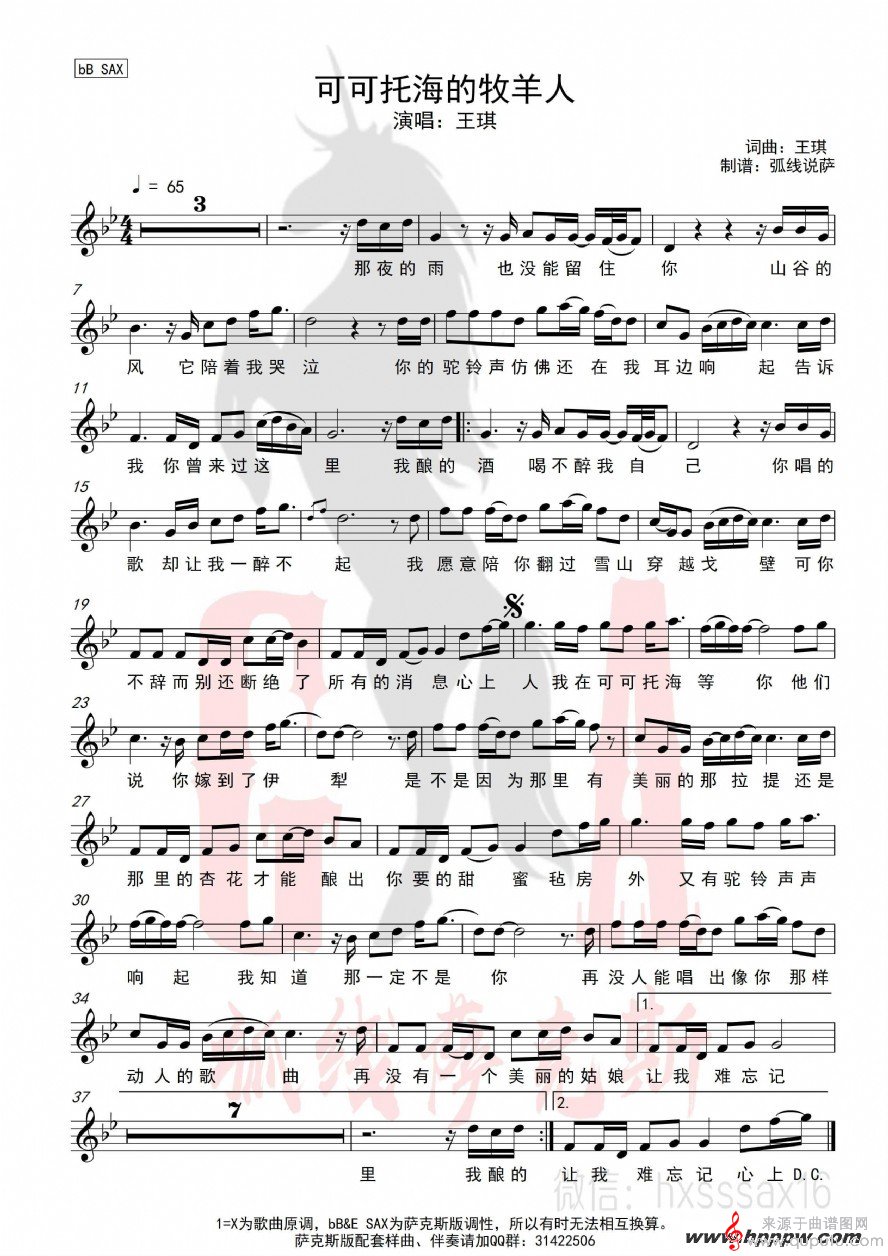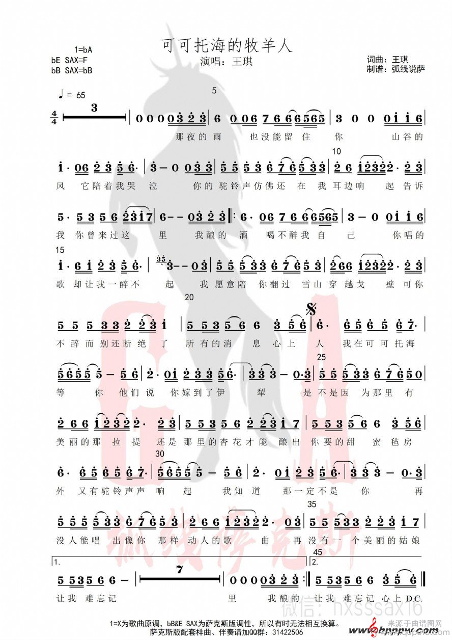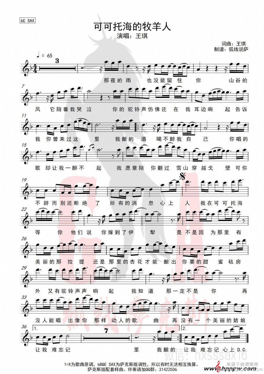 曲谱图网为您提供可可托海的牧羊人(可可托海的牧羊人萨克斯独奏伴奏歌词五线谱曲谱)找谱子,就上曲谱图网。
