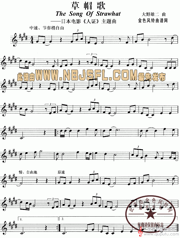 曲谱图网为您提供草帽歌(萨克斯独奏伴奏演奏歌曲简谱)找谱子,就上曲谱图网。