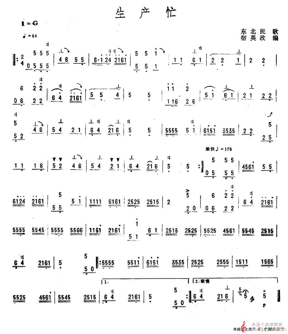 曲谱图网为您提供生产忙歌曲简谱(东北民歌宿英改编)找谱子,就上曲谱图网。