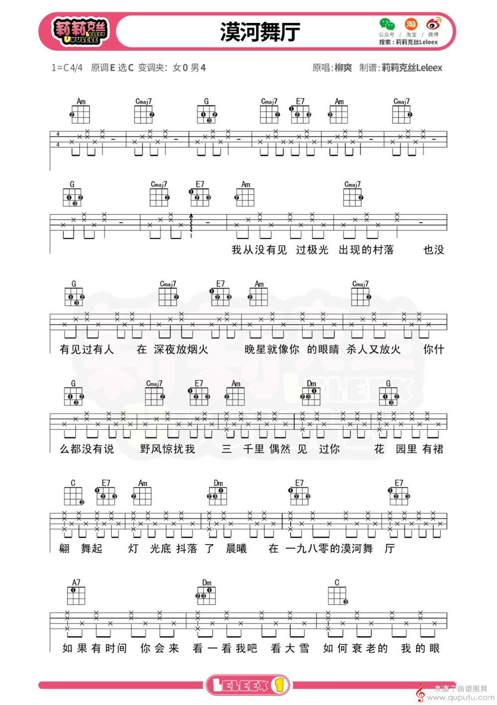 曲谱图网为您提供漠河舞厅(尤克里里指弹弹唱教学四线谱)找谱子,就上曲谱图网。