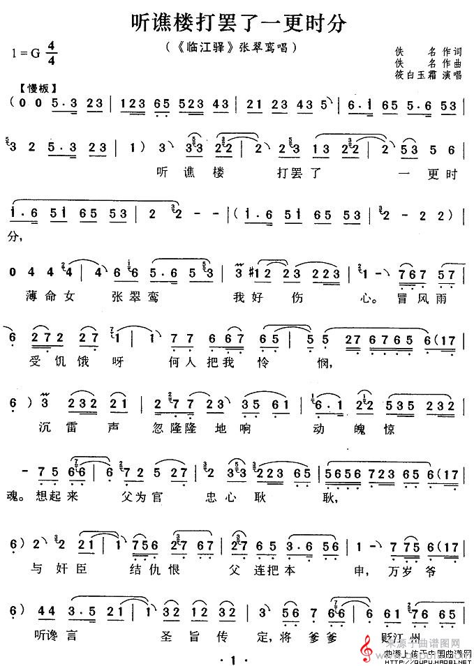 曲谱图网为您提供听谯楼打罢了一更时分(《临江驿》张翠鸾唱段)找谱子,就上曲谱图网。