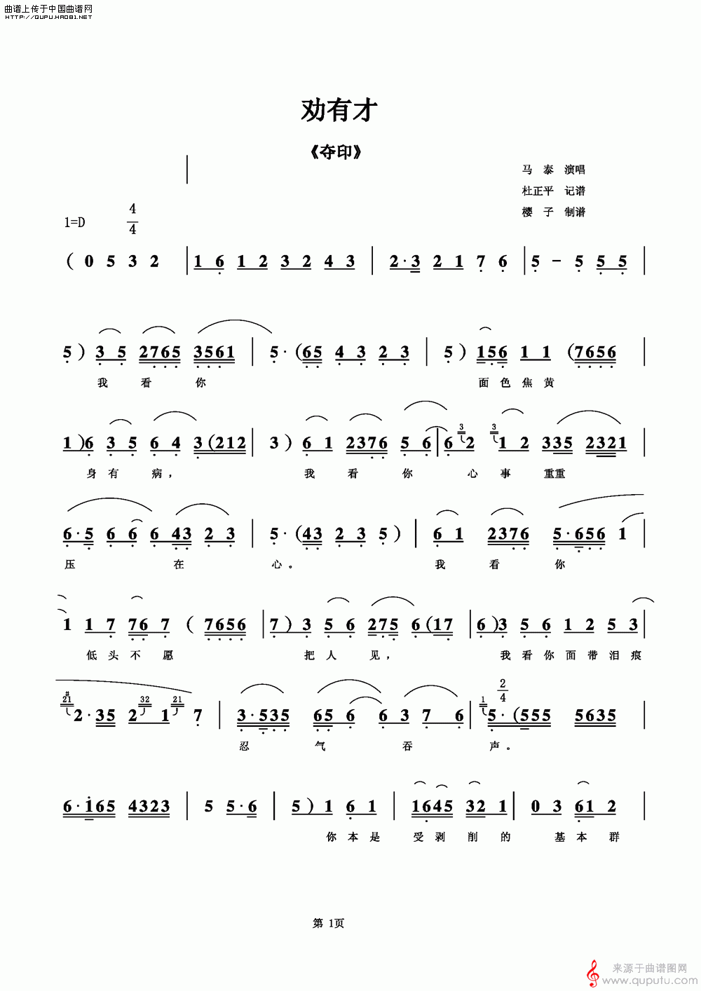 曲谱图网为您提供劝有才(《夺印》选段)找谱子,就上曲谱图网。