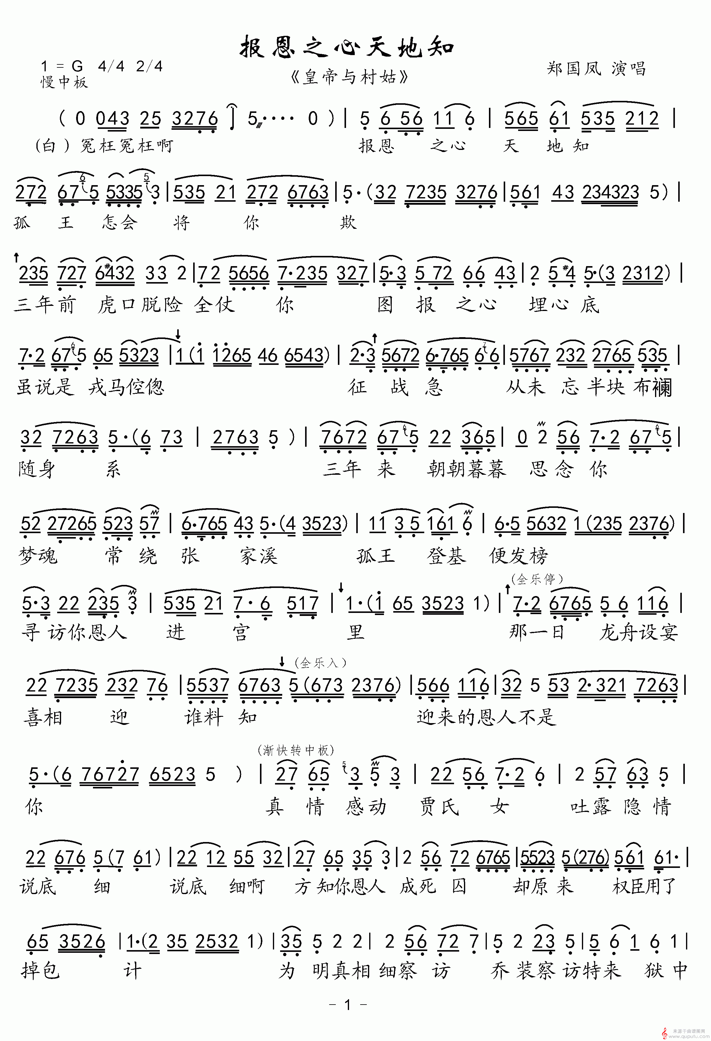 曲谱图网为您提供报恩之心天地知(选自《皇帝与村姑》唱段)找谱子,就上曲谱图网。