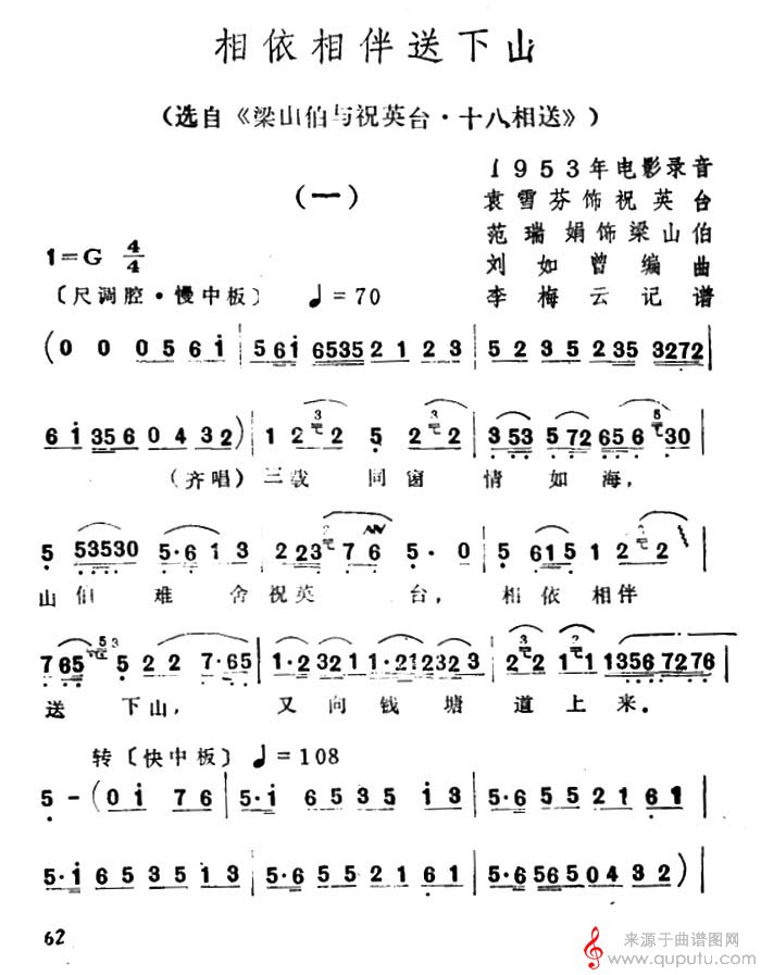 曲谱图网为您提供相依相伴送下山(摘自《梁山伯与祝英台·十八相送》唱段)找谱子,就上曲谱图网。