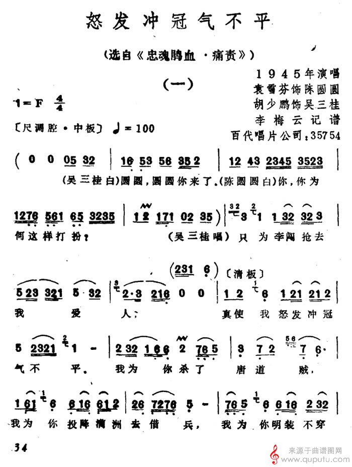 曲谱图网为您提供怒发冲冠气不平(摘选自《忠魂鹃血・痛责》唱段)找谱子,就上曲谱图网。
